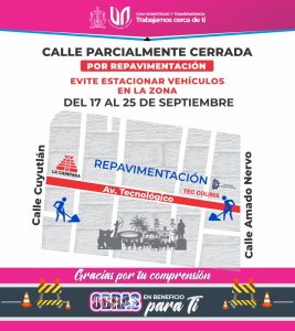 Villa de Álvarez, Col.- El Gobierno Municipal de Villa de Álvarez que encabeza Tey Gutiérrez Andrade dio a conocer el cierre parcial de la avenida Tecnológico desde este miércoles 17 y hasta el 25 de septiembre, por la realización de la obra de repavimentación.