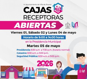Villa de Álvarez, Col.- La Tesorería del Ayuntamiento de Villa de Álvarez informa que las cajas receptoras de pagos ubicadas en la Presidencia Municipal, en la Dirección de Catastro y en el Complejo de Seguridad Pública de Villa de Álvarez, estarán abiertas los días viernes 1, sábado 2 y lunes 4 de mayo del fin de semana largo.