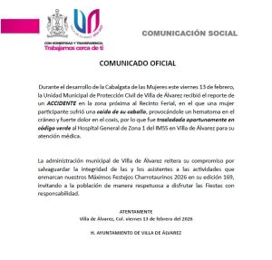 Durante el desarrollo de la Cabalgata de las Mujeres este viernes 13 de febrero, la Unidad Municipal de Protección Civil de Villa de Álvarez recibió el reporte de un ACCIDENTE en la zona próxima al Recinto Ferial, en el que una mujer participante sufrió una caída de su caballo, provocándole un hematoma en el cráneo y fuerte dolor en el coxis, por lo que fue trasladada oportunamente en código verde al Hospital General de Zona 1 del IMSS en Villa de Álvarez para su atención médica.