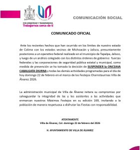 Ante los recientes hechos que han ocurrido en los límites de nuestro estado de Colima con los estados vecinos de Michoacán y Jalisco, presuntamente posteriores a un operativo federal realizado en el municipio de Tapalpa, Jalisco, y luego de un análisis colegiado con los distintos órdenes de gobierno: fuerzas federales y las corporaciones de seguridad pública estatal y municipal, como medida de prevención se ha tomado la decisión de SUSPENDER la ONCEAVA CABALGATA DIURNA y todas las demás actividades programadas para el día de hoy domingo 22 de febrero en el marco de los Festejos Charrotaurinas Villa de Álvarez 2026.