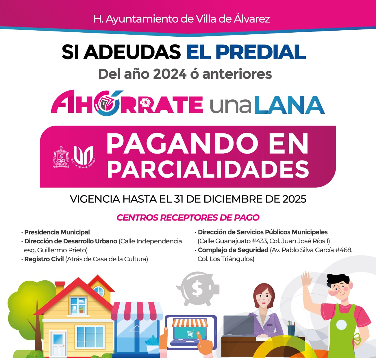 Villa de Álvarez, Col.- El Ayuntamiento de Villa de Álvarez ofrece diversos incentivos fiscales para las y los contribuyentes del municipio, entre otros, el pago en parcialidades del Impuesto Predial a quienes adeuden el año 2024 ó anteriores.