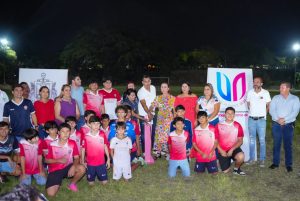 Villa de Álvarez, Col.- La Presidenta Tey Gutiérrez Andrade entregó a deportistas y a vecinos y vecinas la obra de equipamiento de alumbrado público en la cancha de futbol de la colonia Alfredo V. Bonfil, obra realizada con recursos del Fondo de Apoyo a la Infraestructura Social Municipal.
