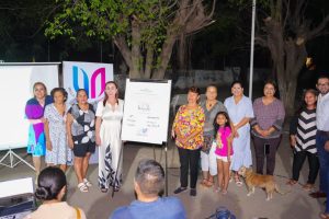 A la entrega de la obra de alumbrado púbico en el jardín de la colonia Juan José Ríos I asistieron la Secretaria del Ayuntamiento, Lizet Rodríguez; las regidoras Teresa Ramírez y Mary Rubio; la Presidenta del Comité de Barrio de la colonia Del Valle, Rosario Ramírez López, y funcionarios y funcionarias municipales.