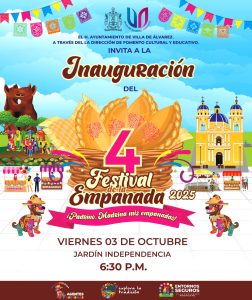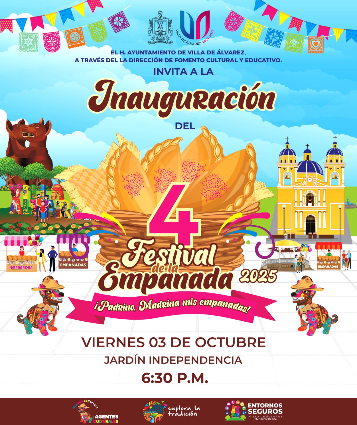 Villa de Álvarez, Col.- Con presentaciones de música de jazz y de trío, una puesta en escena y tres grupos de danza, este viernes en punto de las 7:00 de la noche la Presidenta Tey Gutiérrez Andrade inaugurará en el Jardín Principal de Villa de Álvarez el Cuarto Festival de la Empanada 2025, ¡padrino, madrina mis empanadas!
