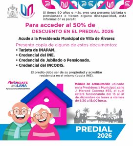 Villa de Álvarez, Col.- Este lunes 15 de diciembre empezó en Villa de Álvarez la campaña de actualización de documentos para que personas adultas mayores, pensionadas, jubiladas o con discapacidad mantengan en 2026 el descuento del 50 por ciento en el Impuesto Predial.