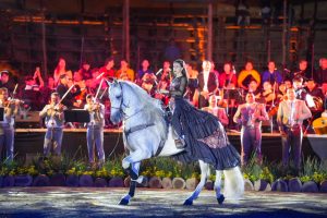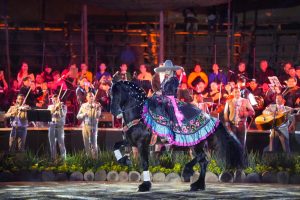 El espectáculo estuvo engalanado por la presencia de caballos de la Cuadra el Encanto y de la Escuela de Montas de las Hermanas Vargas, quienes ofrecieron una muestra de la escaramuza charra al ritmo de los pasosdobles.
